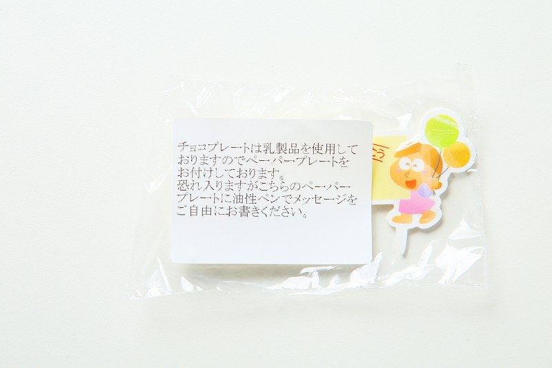 メッセージプレートにつきましては乳製品を使用せずにお作りする事ができませんので、こちらの乳製品アレルギーケーキをご購入いただきましたお客様につきましては、メッセージチョコプレートの代替品としてペーパーメッセージピックをご用意しておりますので、是非ご利用くださいませ。