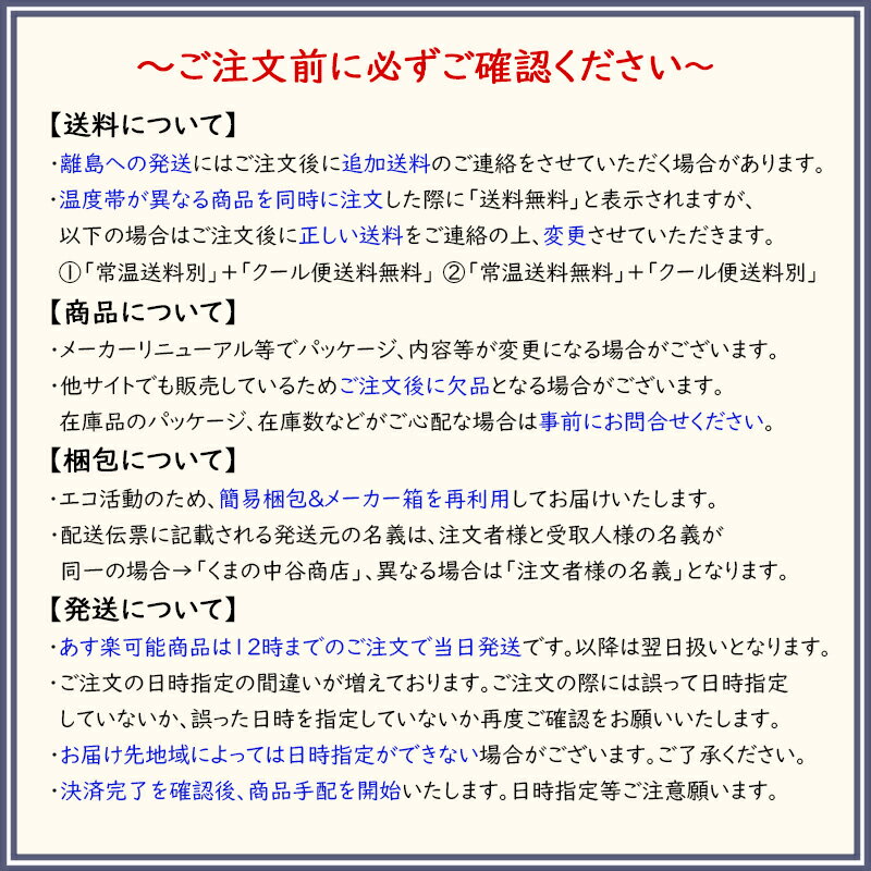 | アミカネットショップでは、最新の商品情報をサイト上に表示するよう努めておりますが、メーカーの都合等により、商品規格・仕様(容量、パッケージ、原材料、原産国等)が変更される場合がございます。このため、実際にお届けする商品とサイト上の表記が異なる場合がございますので、ご使用前には必ずお届けした商品の商品ラベルや注意書きをご確認ください。さらに詳細な商品情報が必要な場合は、メーカー等にお問い合わせください。画像はイメージとなります。実際にお届けする商品とパッケージ等が異なる場合がございますので、予めご了承ください。 |