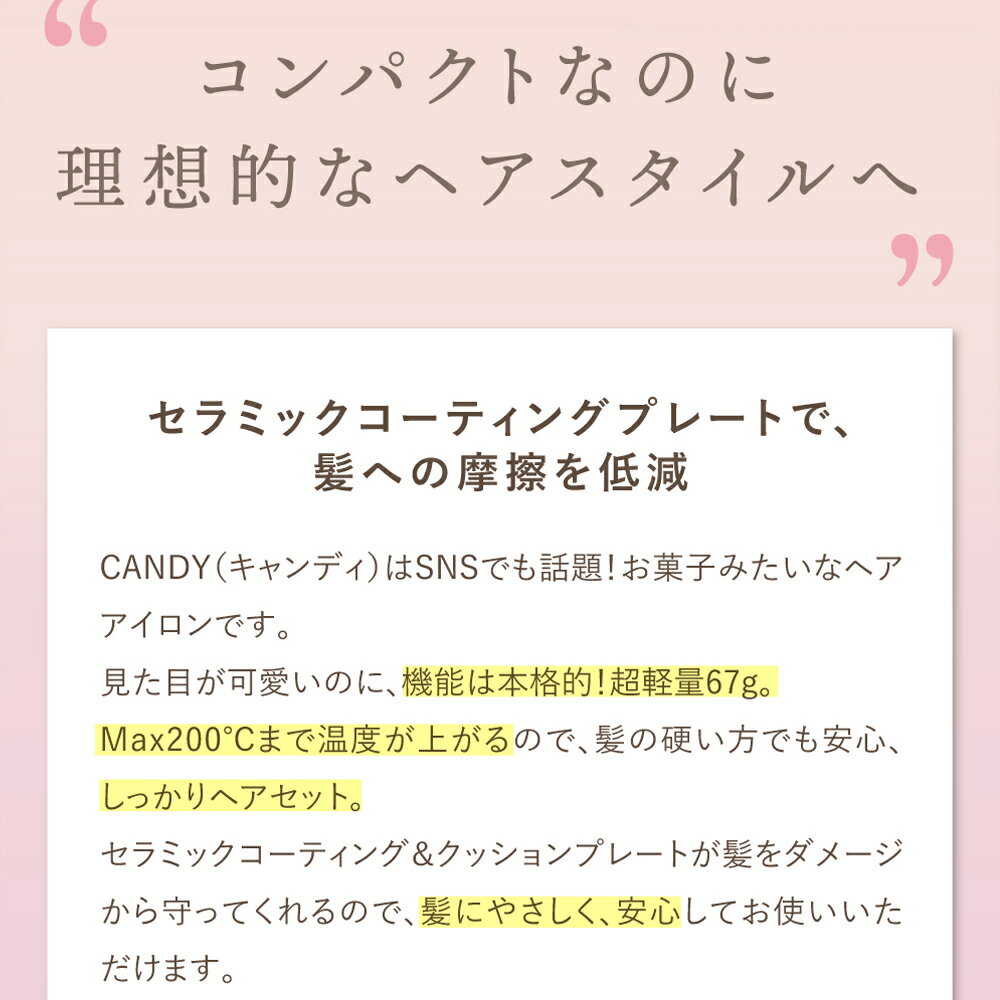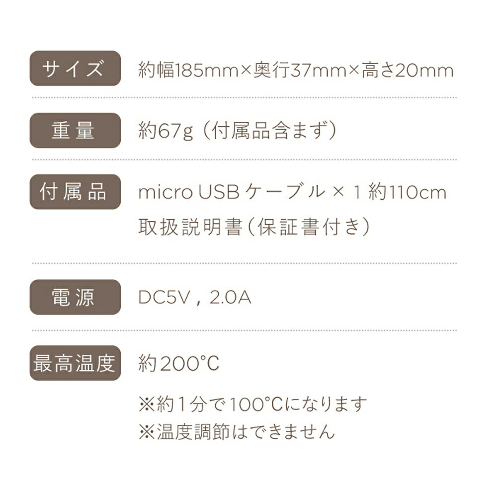 | 仕様 | 消費電力:67W 定格電圧:100~240V(海外対応) サイズ(約):350×40×80mm コード長さ(約):1900mm 重さ(約):420g バレルサイズ:Φ32mm バレル素材:アルミニウム、セラミックコーティング 設定温度:100~220℃ 材質:PA、ラバーコーティング カラー:ホワイト、ブラック | |