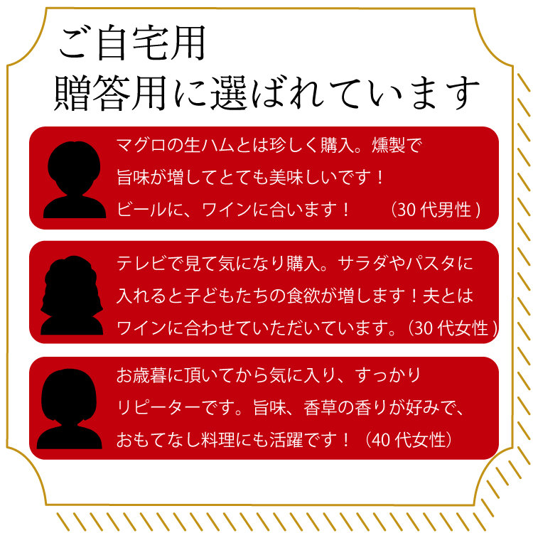 | 産地/原材料 | ・まぐろの生ハム:まぐろ(太平洋)、食塩、食用食物油脂、香辛料(タイム・ローレル)、ソルビトール、pH調整剤、酸化防止剤(V.C)、燻液、着色料(モナスカス・アナトー・ラック)、保存料(分解ペクチン) 販売者:(有)駿河屋賀兵衛(静岡県富士市中之郷5-2) ・カルパッチョドレッシング:砂糖、食用植物油脂、醸造酢、食塩、調味料(アミノ酸)、タマネギ、ニンニク、酸化防止剤、胡椒、増粘剤、ディルウィード、赤ピーマン、パセリ、香辛料抽出物、クチナシ色素 わさびドレッシング:しょうゆ(小麦・大豆含む)、食用植物油脂、砂糖、醸造酢、本わさび、食塩、調味料(アミノ酸等)、増粘剤(キサンタンガム)、香料 | |||||||
