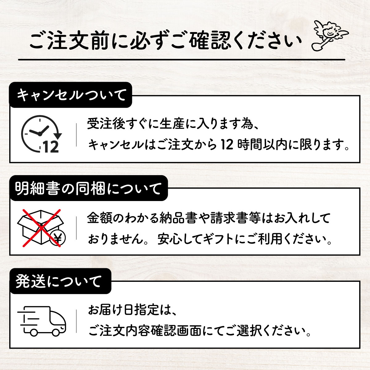 | 注意事項 | 本工場では卵、小麦、乳、アーモンド、オレンジ、大豆、くるみ、ごま、バナナ、もも、ゼラチンを含む製品を生産しています。 |