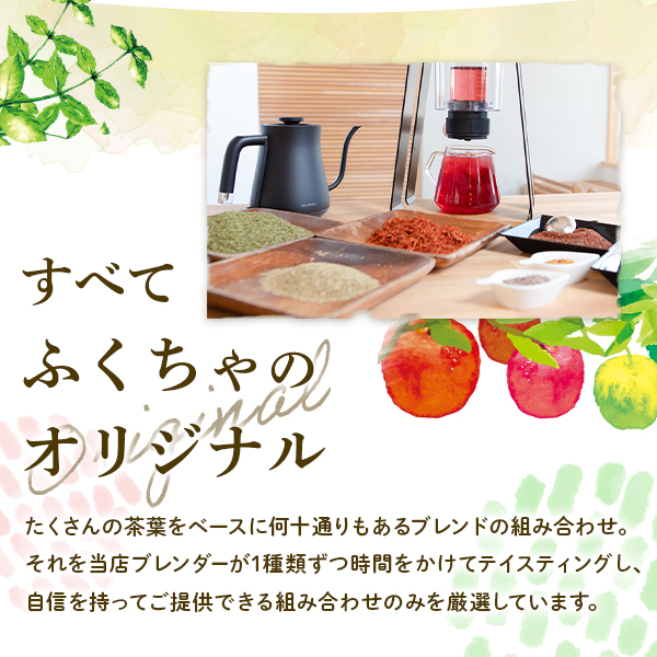 | 原材料(原産国) | ルイボス(南アフリカ共和国)緑茶(国産)はと麦(国産)黒豆(国産)紅茶(国産)ほうじ茶(国産)香料(国産) |