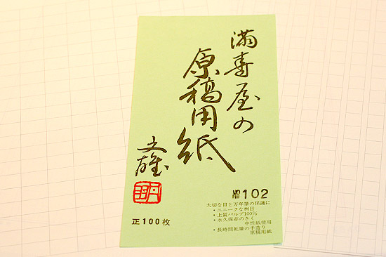 | 仕様 | ・サイズ : 100×148 mm (A6変形) ・罫線範囲 : 75×100 mm ・上の余白 : 30 mm ・下の余白 : 11 mm ・横の余白 : 10 mm ・升目の大きさ : 7×5 mm ( 縦×横 ) ・罫線の色 : 赤・紺・茶 各20枚ずつ ・ルビ罫無し ・200字詰め ・60枚天糊製本 ・クリーム紙 ・日本製 |