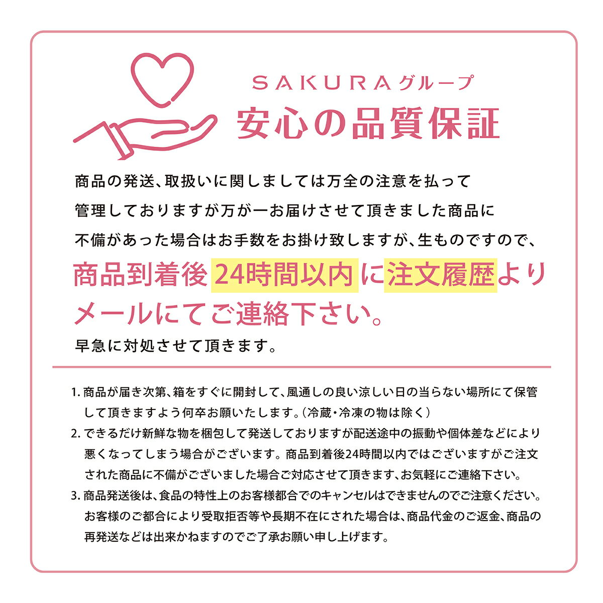 | | 検品を十分にして万全な状態で出荷しておりますが、輸送中の振動などで若干の表面のこすれや果汁漏れが発生する場合等がございます。 予めご了承のうえでご注文をお願いいたします。 |
