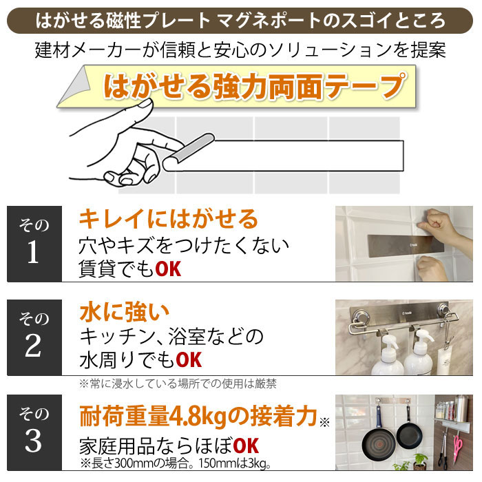 金属(鉄、アルミ、ステンレスなど)、ガラス、内装タイル、キッチンパネル、密着強力な塗装面。※平滑面での加重目安は4.8kg(保証値ではありません)