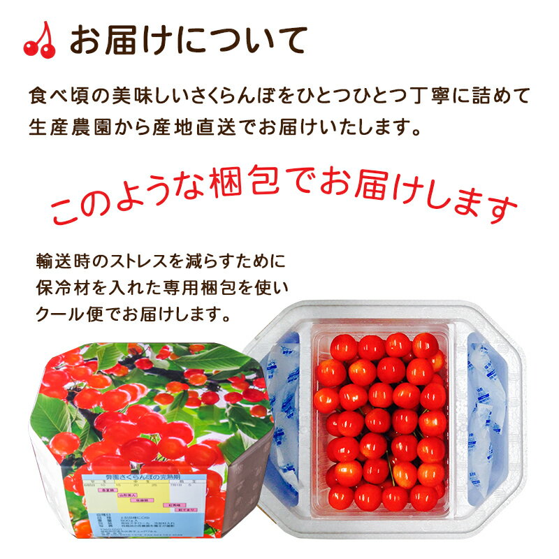 | 商品説明 | 佐藤錦は肉厚でプチっと弾ける実と糖度が高く、甘さと酸味のバランスが大変良い品種です。出荷の際は、生産者が食べ頃を見極めひとつひとつ丁寧に摘み取り箱詰めをおこなっており、ご家庭用はもちろん贈答品としても喜ばれる商品です。 |