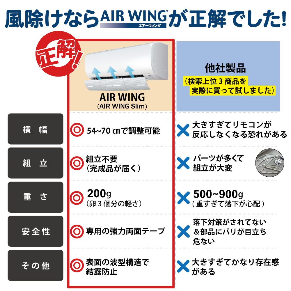 お使いのエアコンに取り付けるだけで、冷房も暖房も快適に!エアコンの風除け「エアーウィング」