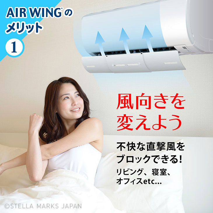| エアーウィングとは? | 簡単ワンタッチ取りつけ 誰でも簡単にワンタッチでエアコンに取り付けできます ネジや穴あけも不要で、天井や壁を傷める必要もありません 風向き設定で直撃風解消 自在な風向き設定で不快な直撃風を解消します 本体ウィングは上下に180度可動し、お好みの角度でキープできます 温度ムラ解消、省エネに貢献 空気を効率的に循環させることで、「暑すぎ」「冷えすぎ」といった 温度ムラを解消でき、光熱費・CO2の削減が期待できます 夏も冬も!オールシーズン対応 ウィング本体の向きを変えるだけで、冷房にも暖房にも対応できるため、 1年中使えて大変便利です |