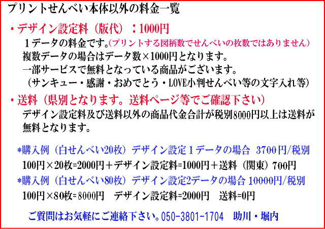 へ投稿頂いたデータで完成イメージを作成して相互確認しておりますので、お取り引きが完了するまでは@kaiodo.co.jpのメールを受信出来る状態でお願い致します。相互確認が出来ない場合はご注文をキャンセルさせて頂く場合がございますのでご了承お願い致します。 - 1デザインに付きデザイン設定料(版代)1,100円が必要となります。尚、一度設定したデザインで追加注文の場合はデザイン設定料は掛からず煎餅代金のみとなります。