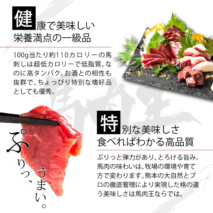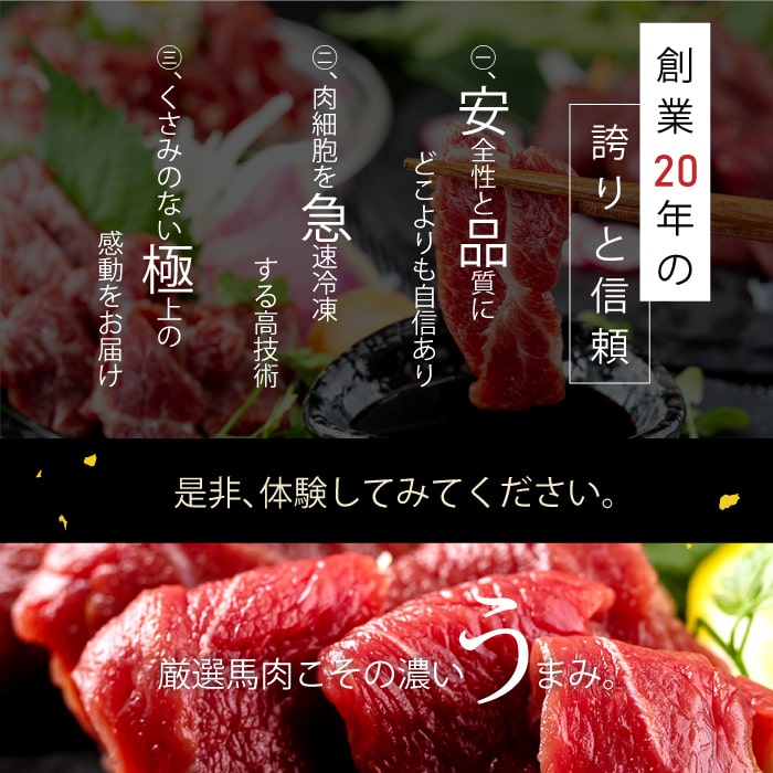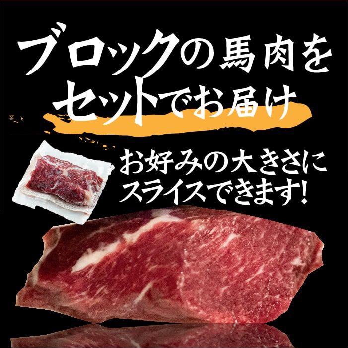 | 名称 | カナダ産国内肥育馬肉 ブロック赤身盛合 各100g×2 (3つの厳選醤油付き) |