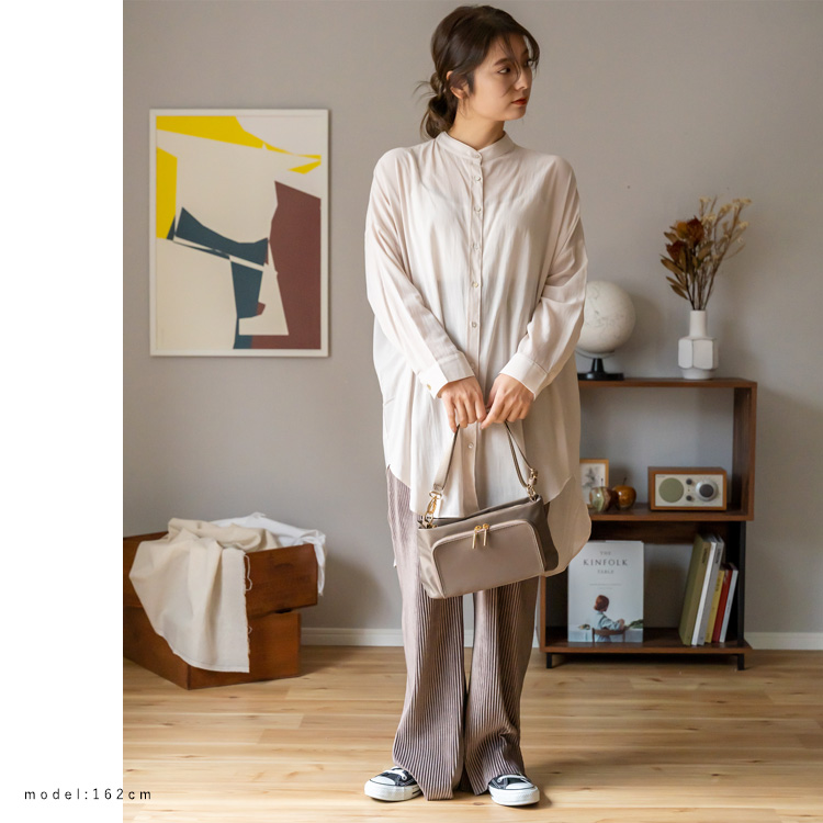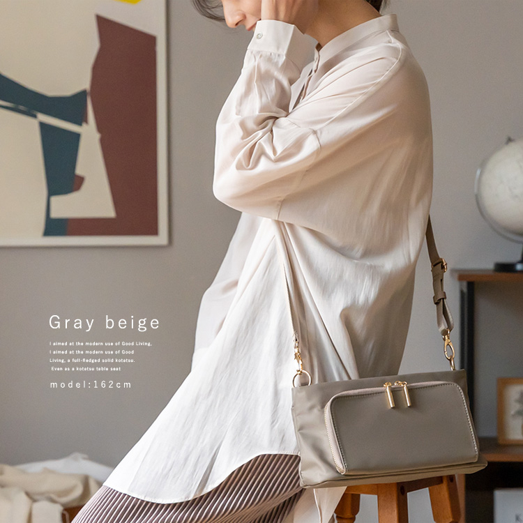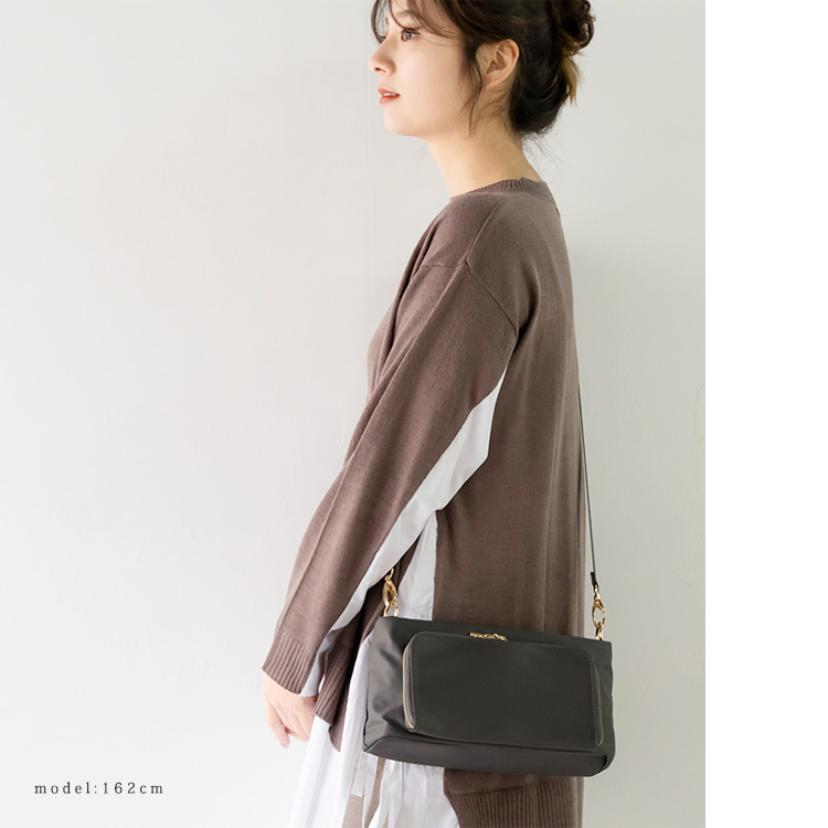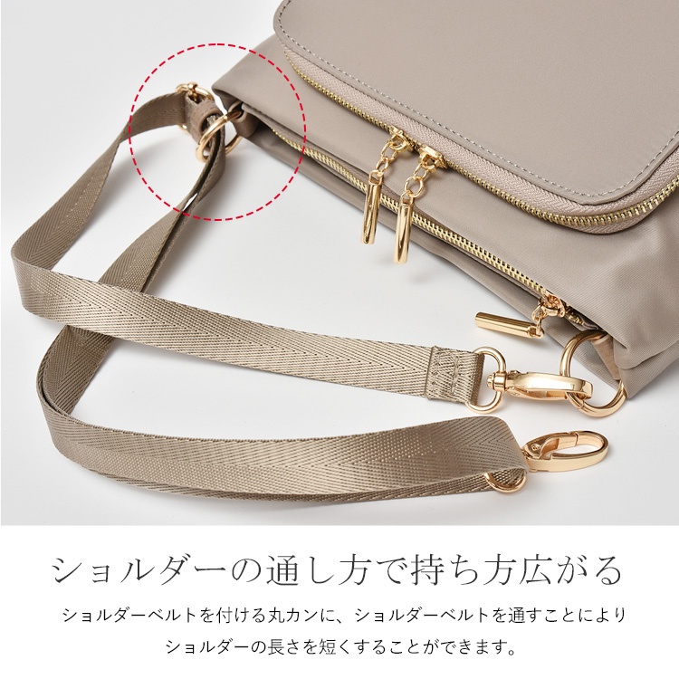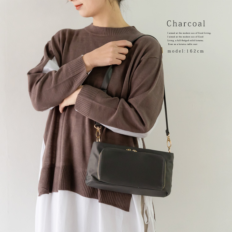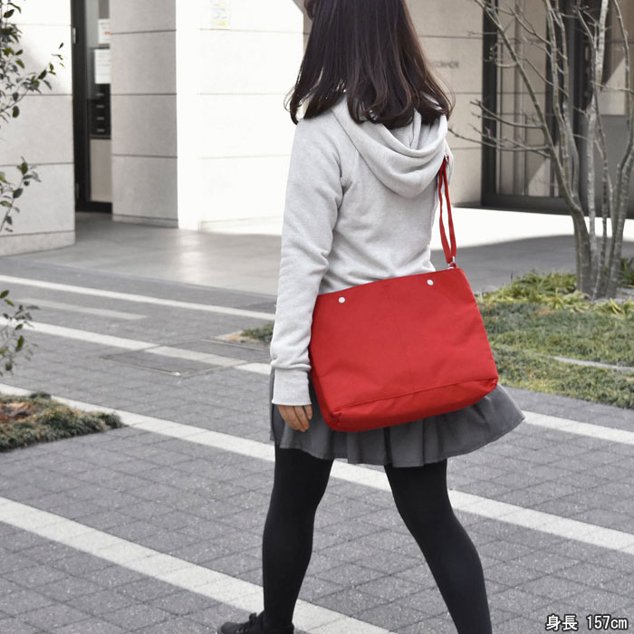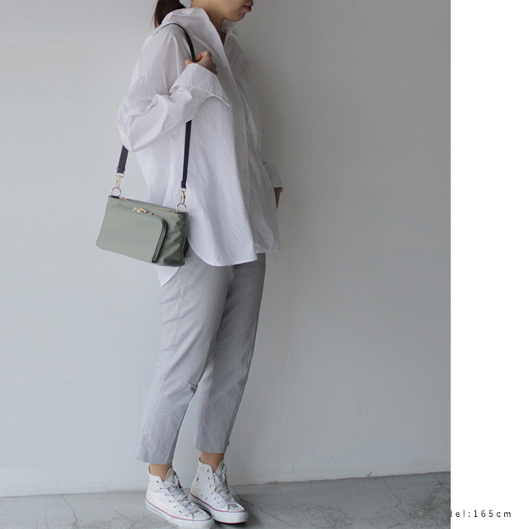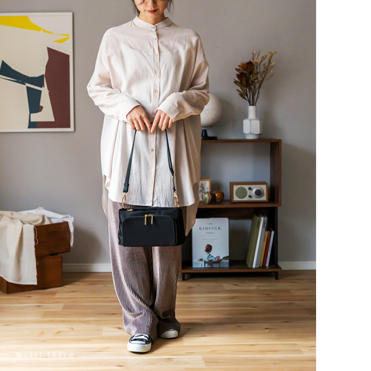 長さ調節可能なショルダーベルトで、肩掛け・斜めがけも可能。