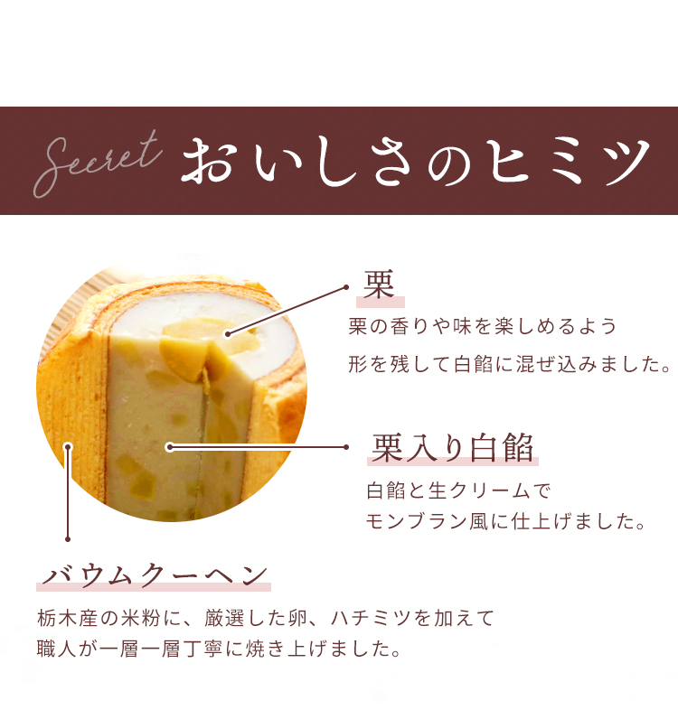 | 結婚式をはじめお祝い事に欠かせないお菓子「バウムクーヘン」それは年輪のように見える切り口が「長寿」や「繁栄」をイメージさせることに由来します。 さらに樹凛バウムは米が原料。 「八十八」の文字通り、幾重にも広がり重なる幸せのお菓子です。 ご贈答には送っても送られても喜ばれる樹凛バウムをどうぞご用命下さい。 |