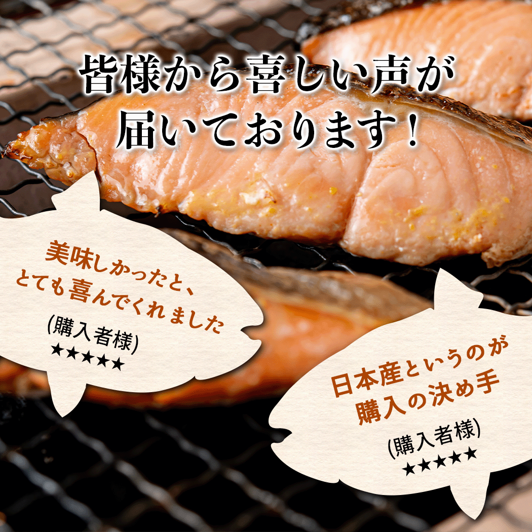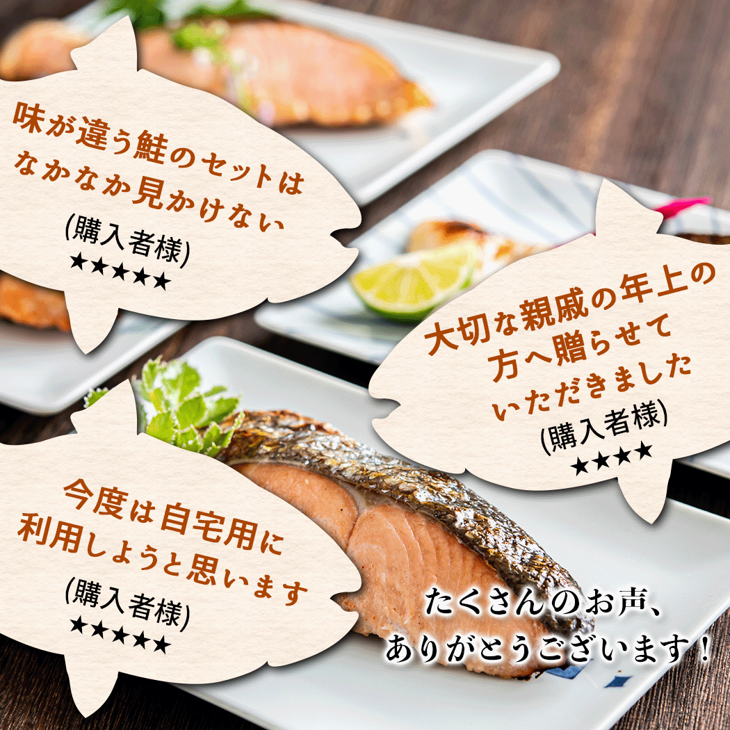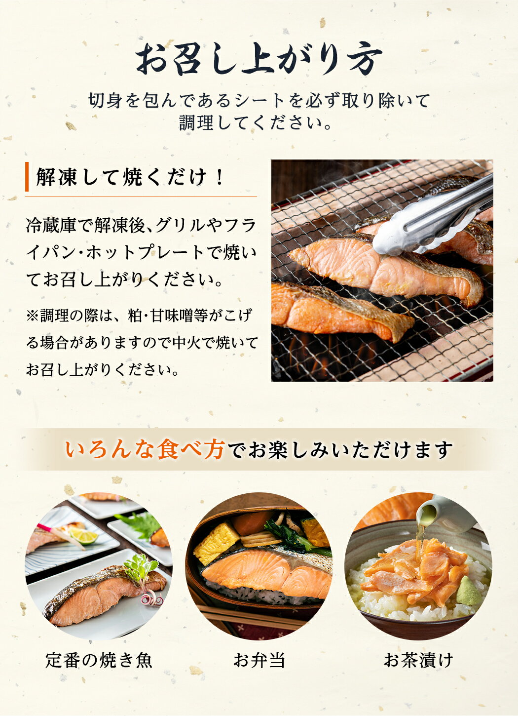 | 原材料 | 【秋鮭粕漬け】しろさけ(北海道)、酒かす、酒、みりん、砂糖、食塩 【秋鮭西京漬け】しろさけ(北海道)、味噌、砂糖、米発酵調味料、食塩、豚ゼラチン、香辛料/増粘剤(加工澱粉) 【秋鮭甘味噌漬】しろさけ(北海道)、味噌、酒、みりん、砂糖、食塩/酒精 【秋鮭辛子明太子漬け】しろさけ(北海道)、酒、みりん風調味料、唐辛子、たらこ、食塩/酸味料、調味料(アミノ酸等)、酸化防止剤(V.C)、ナイアシン、発色剤(亜硝酸Na)、赤色102号、黄色5号 |