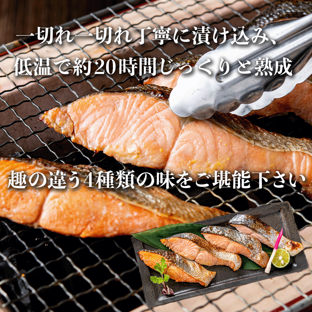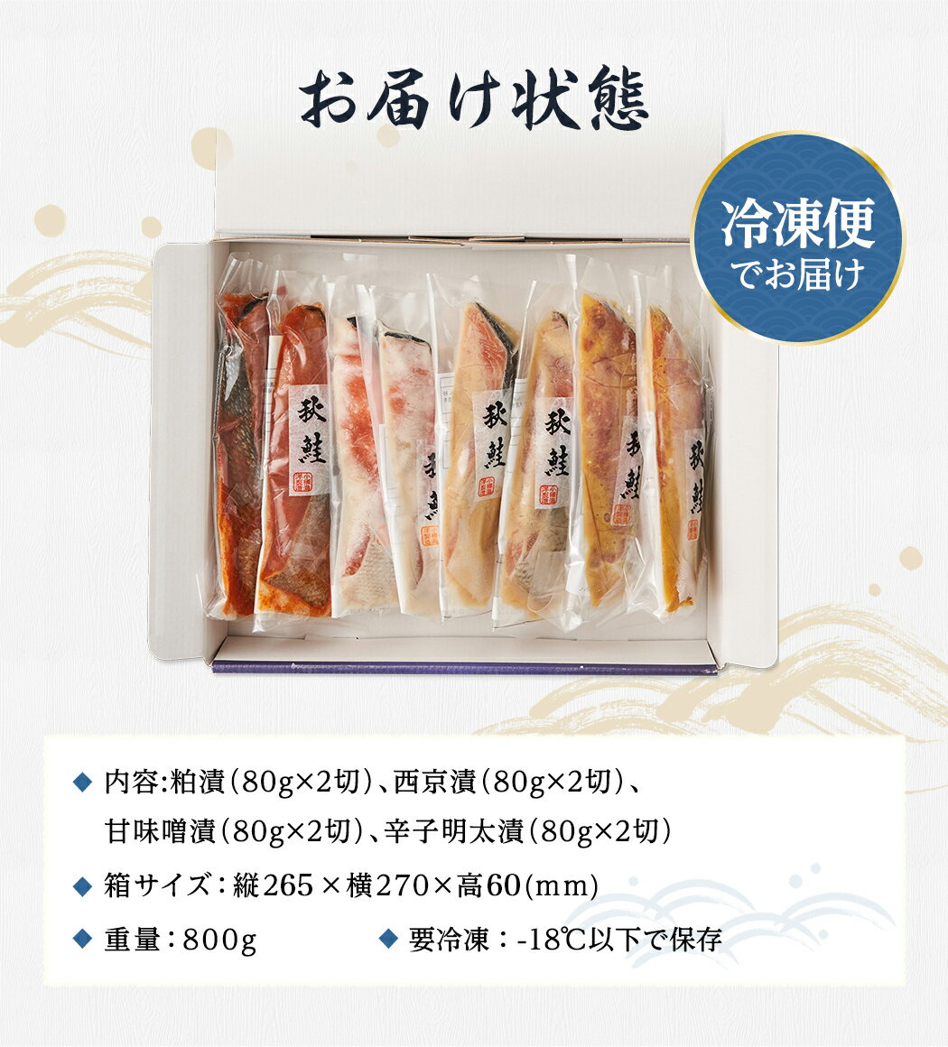 | 内容量 | 秋鮭粕漬切身/80g×2切 秋鮭西京漬切身/80g×2切 秋鮭甘味噌漬切身/80g×2切 秋鮭辛子明太子漬切身/80g×2切 |