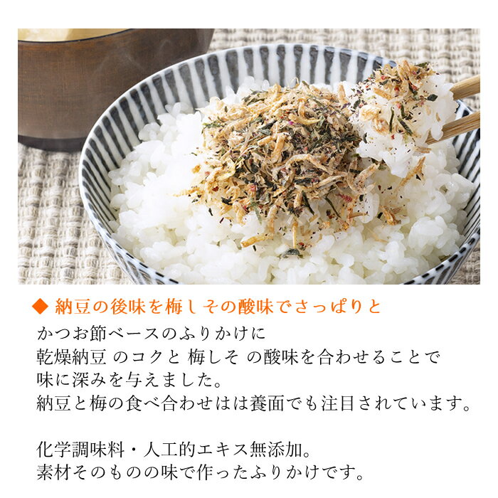 | 原材料名 | かつお節(国内製造)、乾燥赤しそ(赤しそ、食塩、梅酢)、わかめ加工品(わかめ、粗糖、食塩、昆布粉末)、乾燥おきあみ、乾燥納豆(大豆を含む)、乾燥梅肉(梅干(紀州産)、シソ梅酢)、のり |