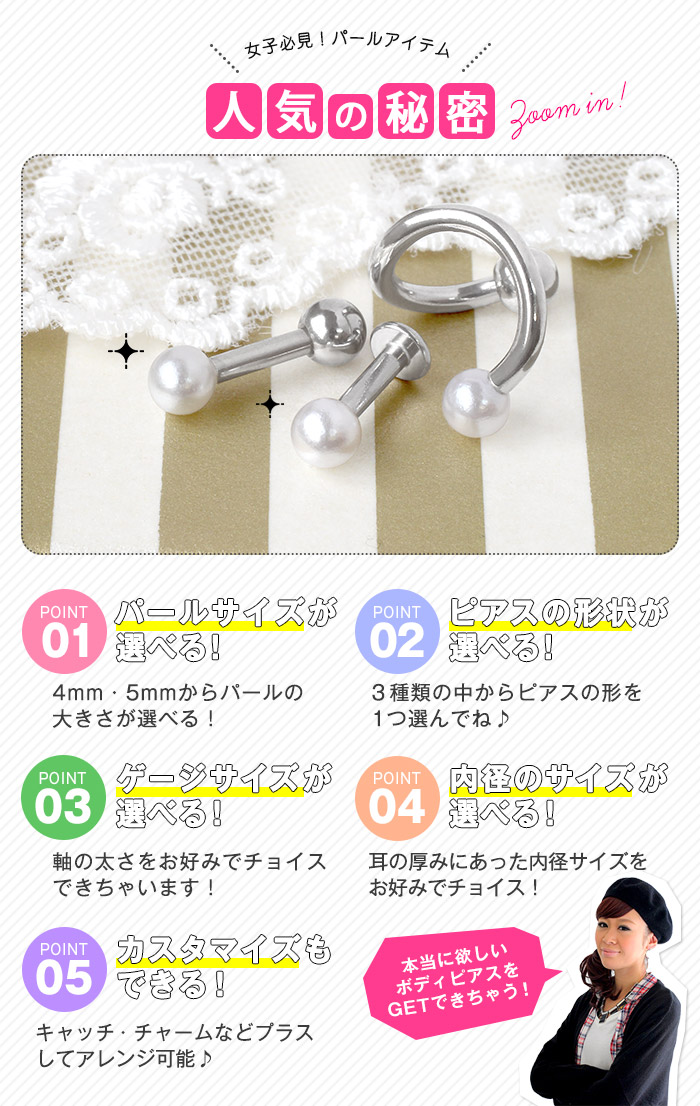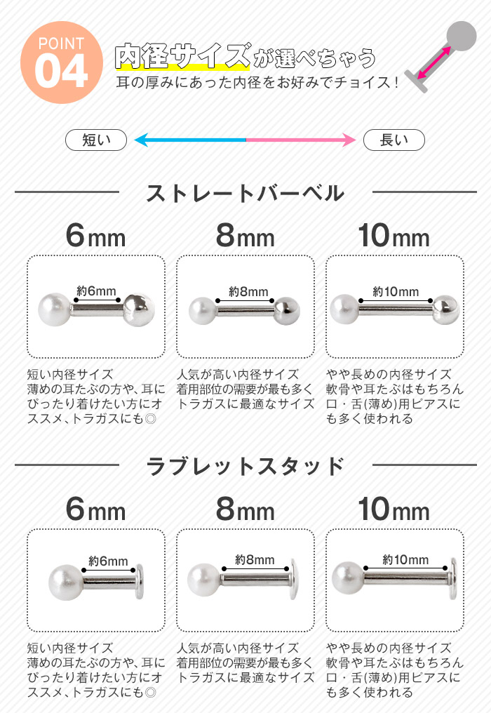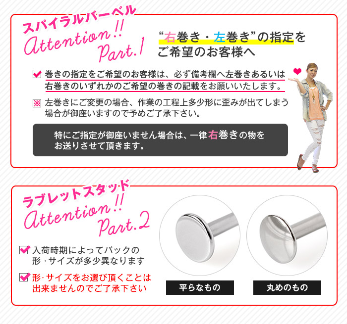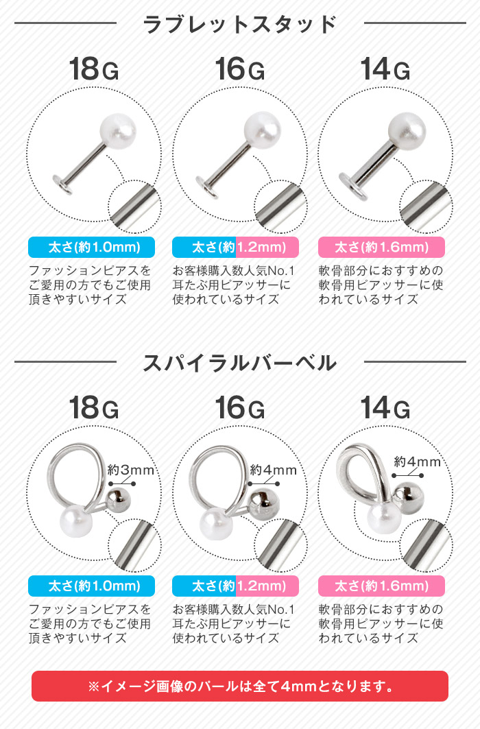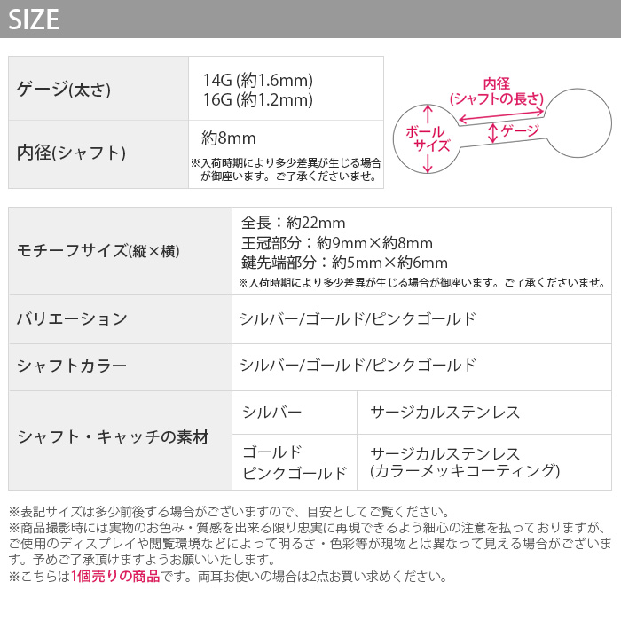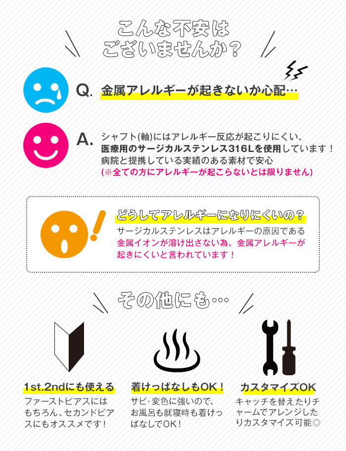 | シャフト・キャッチの素材 | シルバー:サージカルステンレス ゴールド/ピンクゴールド:サージカルステンレス(カラーメッキコーティング) |
