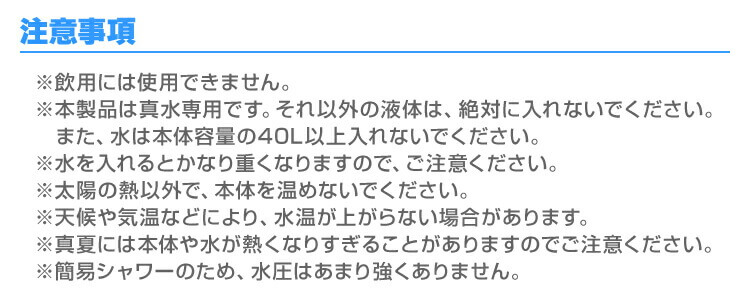 | 注意事項 | ・飲用には使用できません。 ・本製品は真水専用です。それ以外の液体は、絶対に入れないでください。また、水は、バッグ容量の20L以上入れないでください。 ・太陽の熱以外で、バッグを温めないでください。 ・天候や気温などにより、水が温まらない場合があります。 ・真夏には本体や水が熱くなることがありますので、火傷にご注意ください。 ・あくまでも簡易シャワーです。水圧は強くありません。 ・商品は、モニターによって色合いが異なって見える場合があります。 ・仕様・デザインは改良のため予告なく変更することがあります。 |