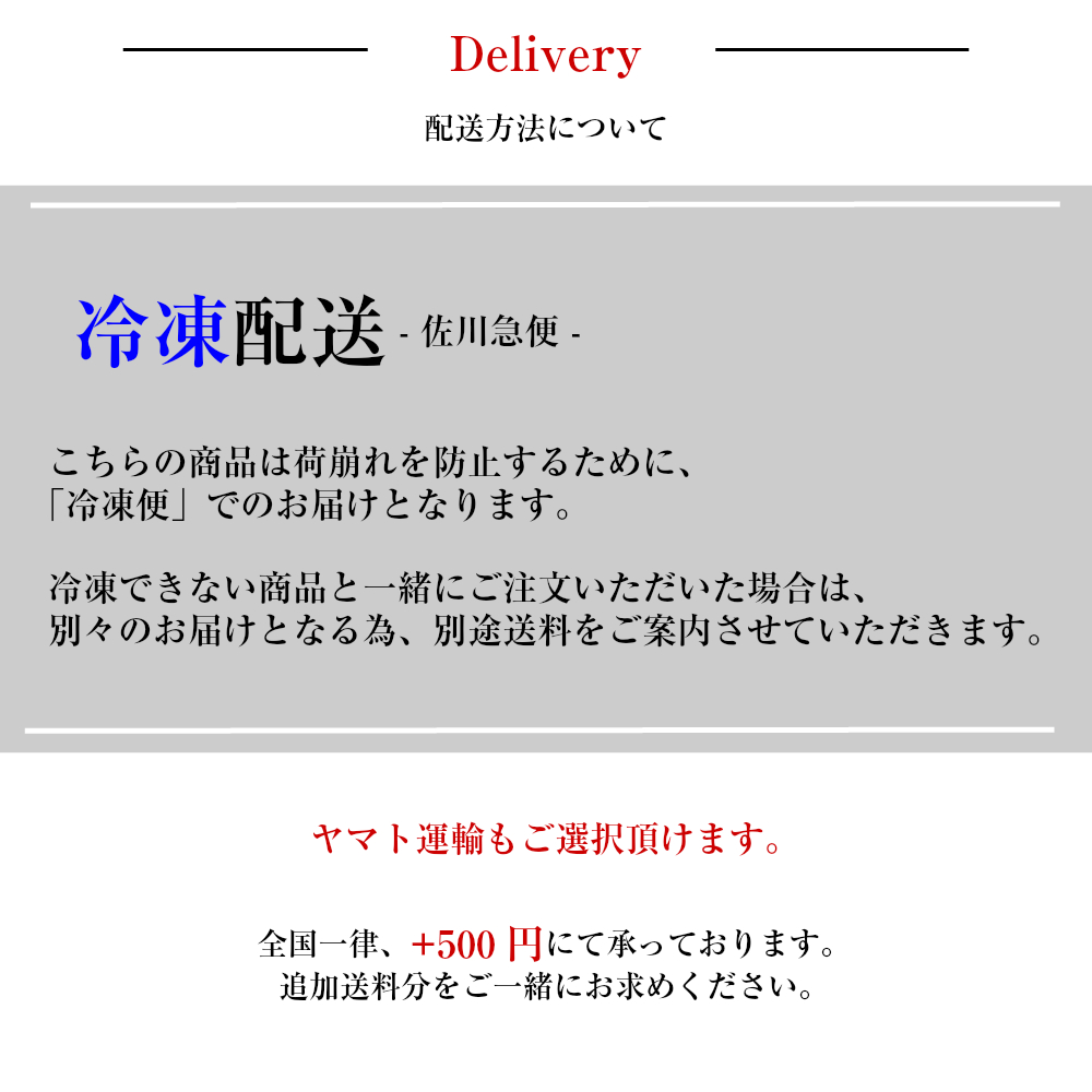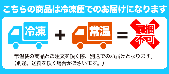 | 配送方法 | 冷凍クール便 ※荷崩れを防止する為、冷凍にてお届けさせて頂きます。 |